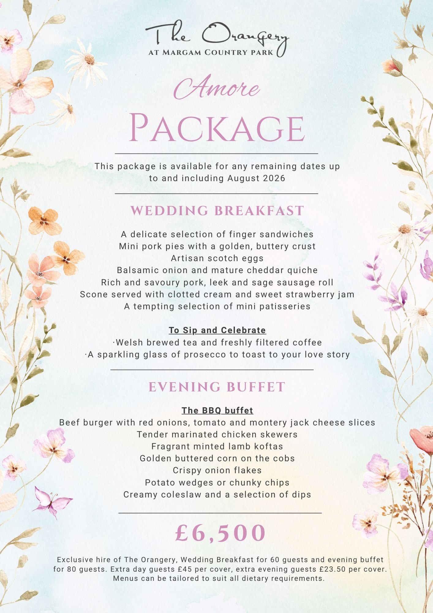 Exclusive Hire of The Orangery, wedding breakfast for 60 guests and an evening buffet for 80 guests. Extra day guests £45 per cover, extra evening guests £23.50 per cover. Menus can be tailored to suit all dietary requirements.